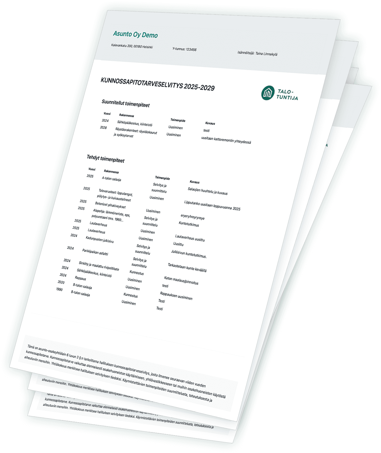 Talotuntijalla voit syöttää taloyhtiön perustiedot (rakennusvuosi, tehdyt remontit) ja luoda raportin, joka näyttää kiinteistön kunnon ja tulevat korjaustarpeet. Tämä erottaa sinut kilpailijoista – ja osoittaa, että tarjoat enemmän kuin pelkkää hallintoa.